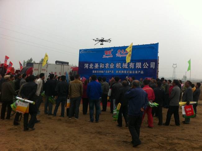 同時,在深松演示會上我公司同西安鯤化航空科技有限公司聯(lián)合研制的“農(nóng)用植保噴藥無人飛機(jī)”成為了此次演示會的一大亮點,本公司此次共攜帶二架無人飛機(jī)進(jìn)行演示,一架做為農(nóng)用噴藥,進(jìn)行實地演示;一架做為航空航拍,全程跟蹤拍攝演示會現(xiàn)場;各企業(yè)代表及農(nóng)民用戶給予了圣和公司高度。