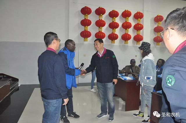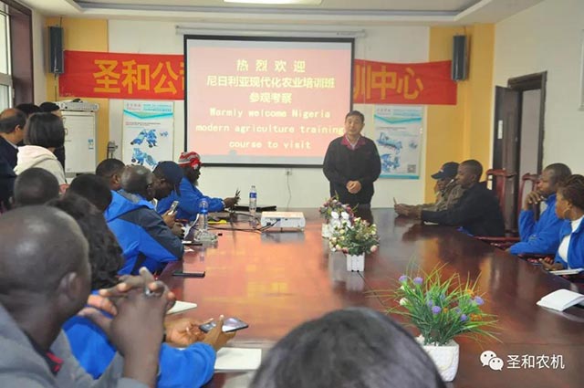 (10月24日)尼日利亞農(nóng)場院及部分政府人員組織現(xiàn)代化農(nóng)業(yè)培訓(xùn)班來河北圣和農(nóng)業(yè)機械有限公司參觀學(xué)習(xí),公司董事長王新芳、總經(jīng)理師西峰及常務(wù)副總經(jīng)理蘇山嶺帶領(lǐng)團隊熱情接待,并在公司會議室交流探討,公司董事長王新芳致歡迎詞,介紹了企業(yè)概況、發(fā)展理念和發(fā)展目標,圣和公司正以優(yōu)異的產(chǎn)品邁向現(xiàn)代化、國際化。